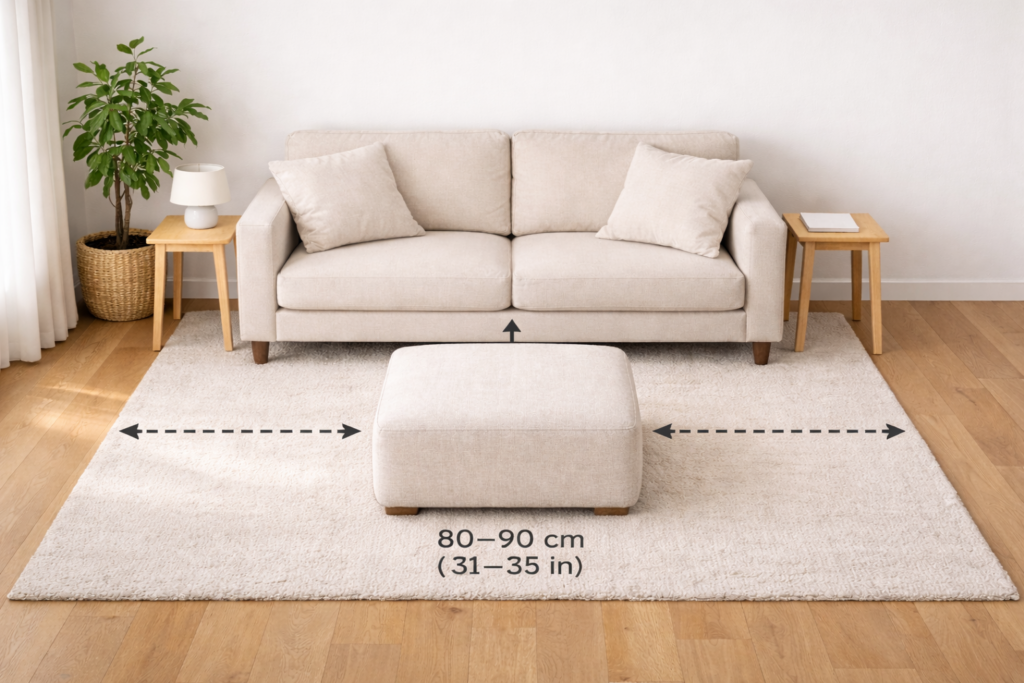 - Replace the coffee table with an ottoman: 60–90 cm / 24–35 in wide.