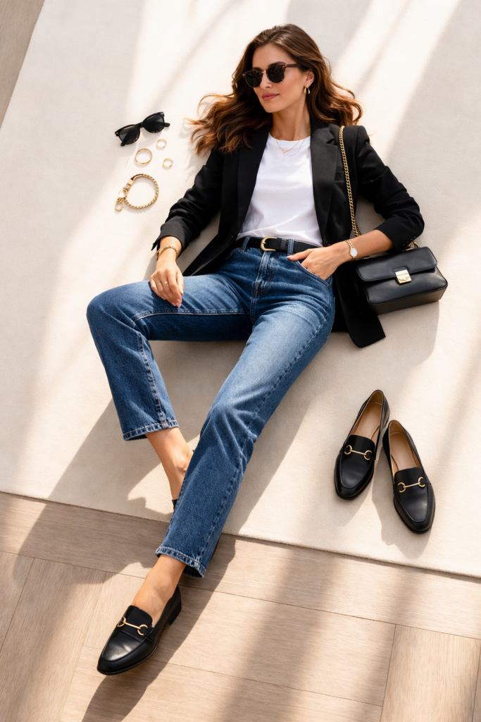 1) Blazer + White Tee + Straight Jeans + Loafers