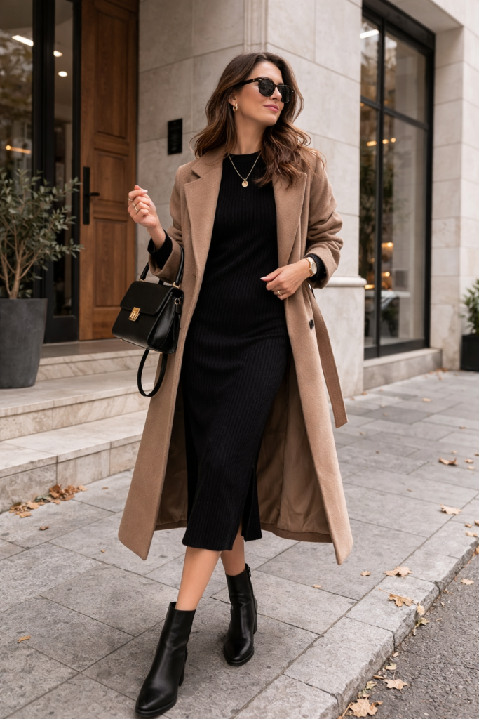 2) Knit Midi Dress + Long Coat + Ankle Boots