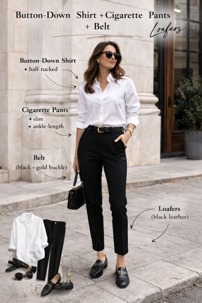 3) Button-Down Shirt + Cigarette Pants + Belt + Loafers