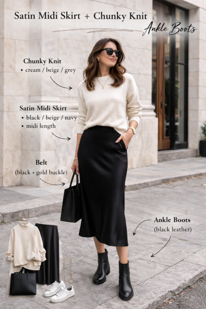 5) Satin Midi Skirt + Chunky Knit + Ankle Boots