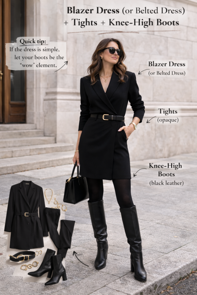 7) Blazer Dress (or Belted Dress) + Tights + Knee-High Boots