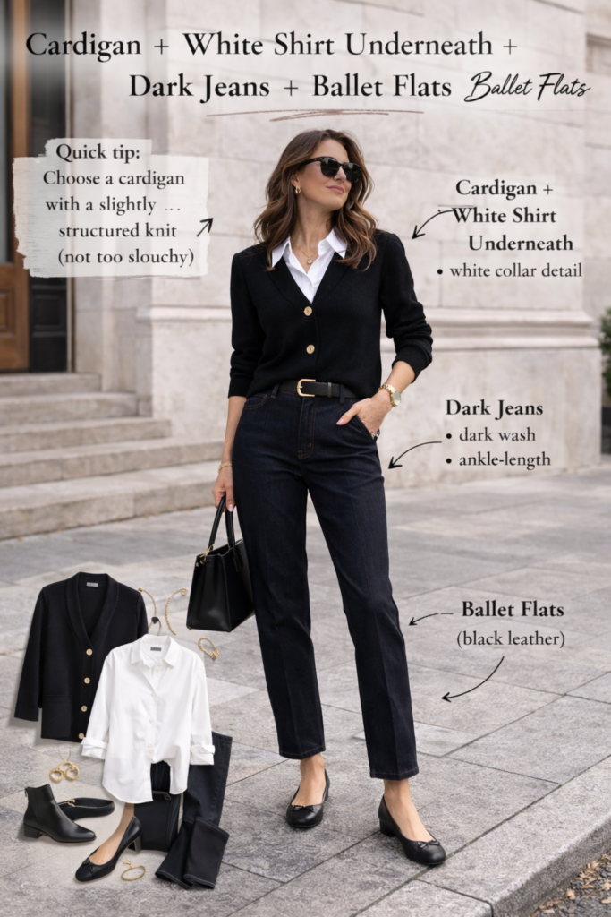8) Cardigan + White Shirt Underneath + Dark Jeans + Ballet Flats