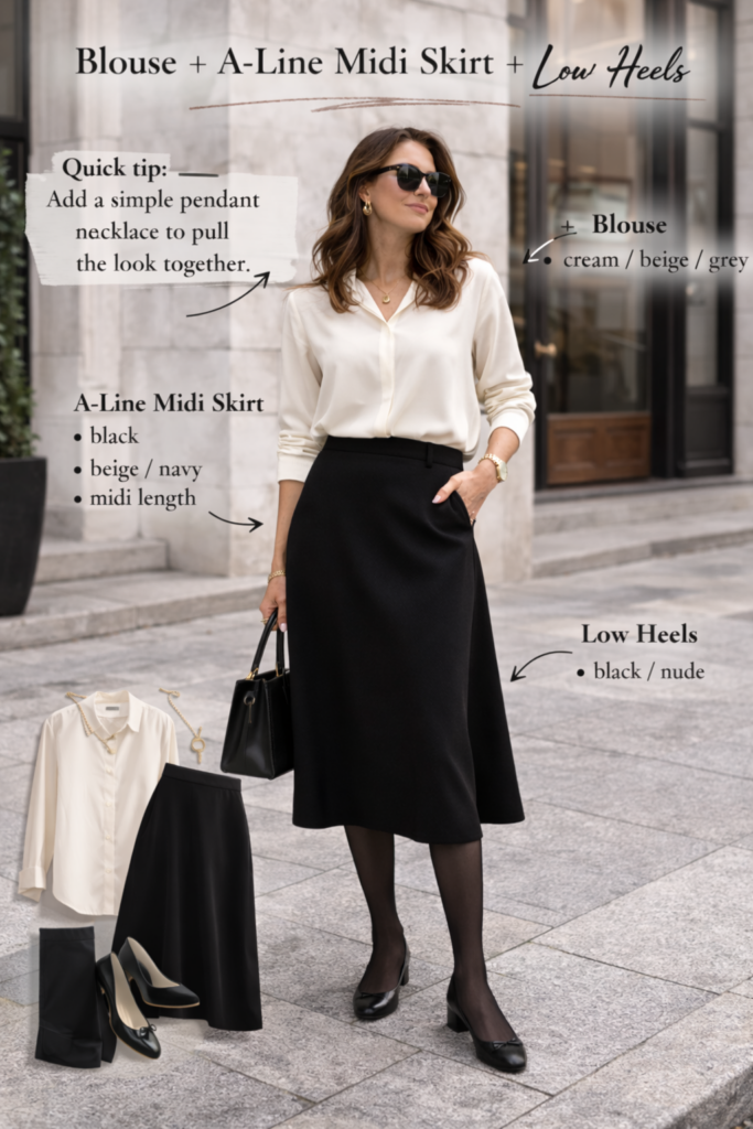 9) Blouse + A-Line Midi Skirt + Low Heels