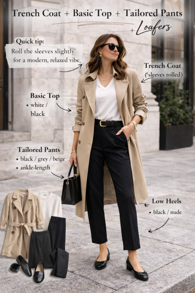 10) Trench Coat + Basic Top + Tailored Pants + Loafers