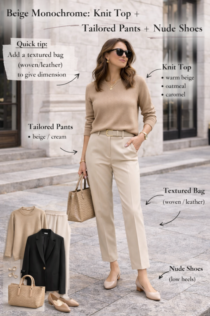 13) Beige Monochrome: Knit Top + Tailored Pants + Nude Shoes