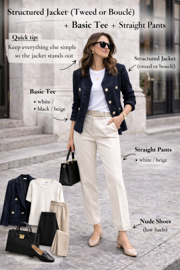 14) Structured Jacket (Tweed or Bouclé) + Basic Tee + Straight Pants